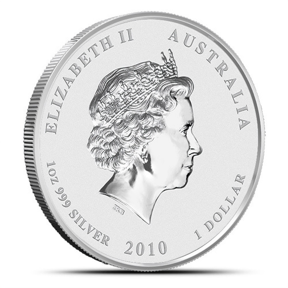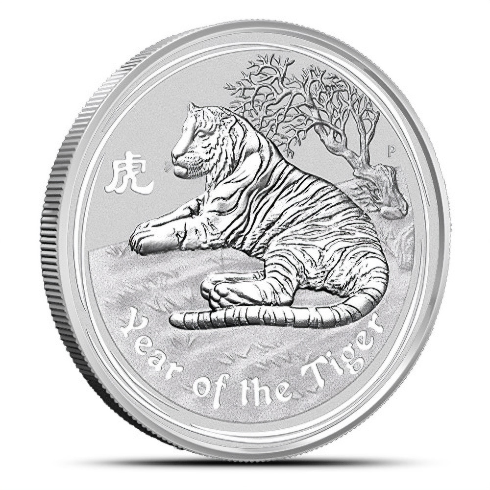 En el reverso, se aprecia un tigre recostado sobre una saliente rocosa cubierta de pasto, en una escena serena pero poderosa. El diseño incluye además la inscripción “Year of the Tiger”, el carácter chino de la palabra tigre y la marca de ceca “P” de The Perth Mint. Es una imagen muy bien lograda porque transmite justo lo que simboliza este signo: control, fuerza contenida y presencia.