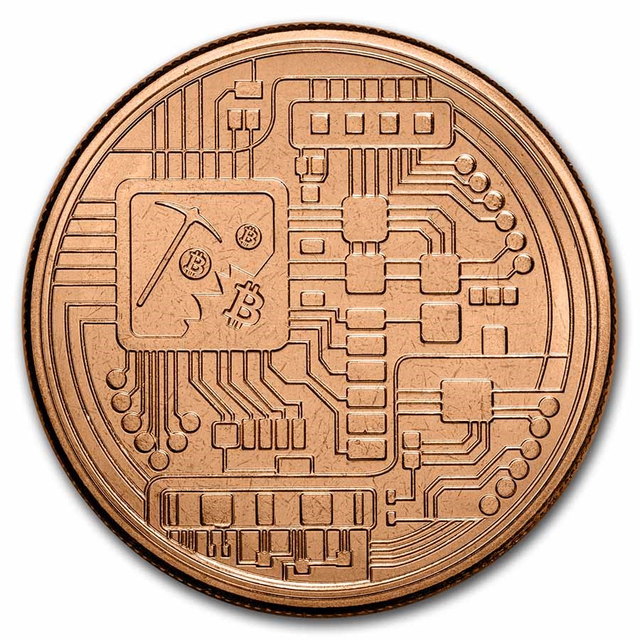En el anverso, el diseño mantiene un concepto tecnológico con un pico extrayendo Bitcoin, haciendo alusión a la minería digital proof of work.